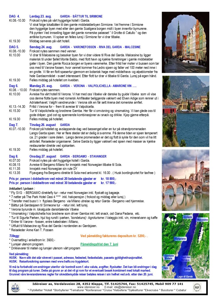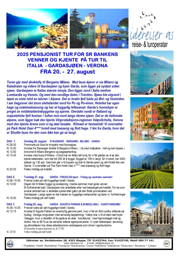 2025 PENSJONIST TUR FOR SR BANKENS VENNER OG KJENTE PÅ TUR TIL ITALIA – GARDASJØEN – VERONA FRA 20. – 27. august Del dette: Skriv ut(åpnes i en ny fane) Skriv ut E-post en lenke til en venn(åpnes i en ny fane) E-post Del på Facebook(åpnes i en ny fane) Facebook Del på LinkedIn(åpnes i en ny fane) LinkedIn Del på X(åpnes i en ny fane) X Del på Tumbl(åpnes i en ny fane) Tumblr Lik Laster inn...
